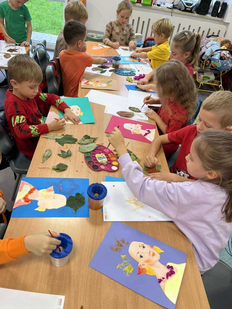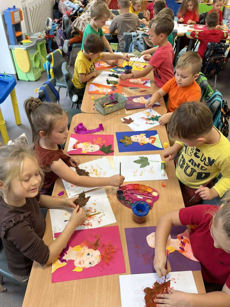 W grupie "Pszczółki" dzieci, wykorzystując farby i prawdziwe liście, tworzyły portrety Pani Jesieni. W grupie "Biedronki" przedszkolaki malowały kolorowe jesienne drzewa, również używając farb. Obie grupy kolorowały postać Pani Jesieni oraz brały udział w tematycznych zabawach i grach związanych z tą porą roku.
