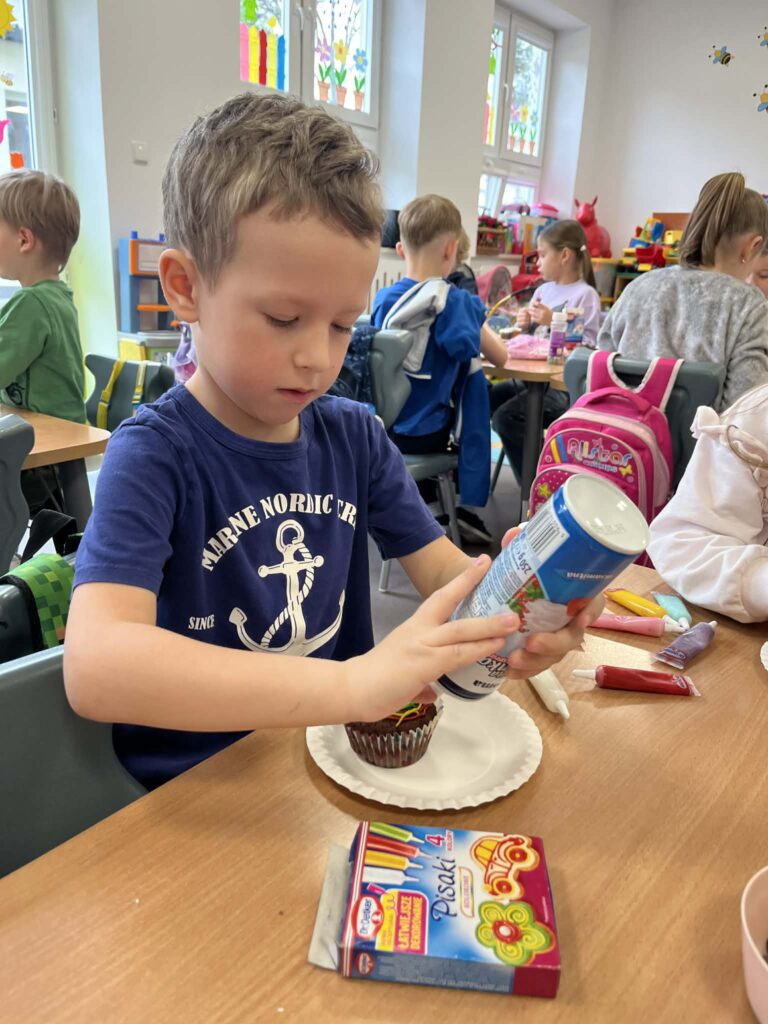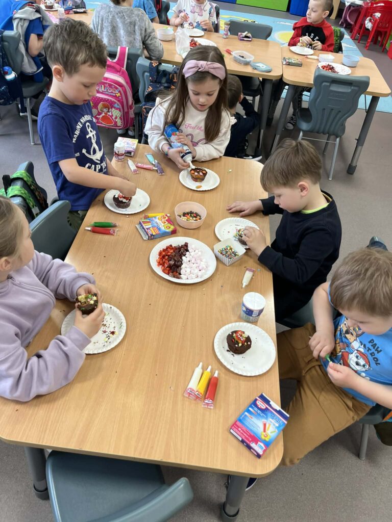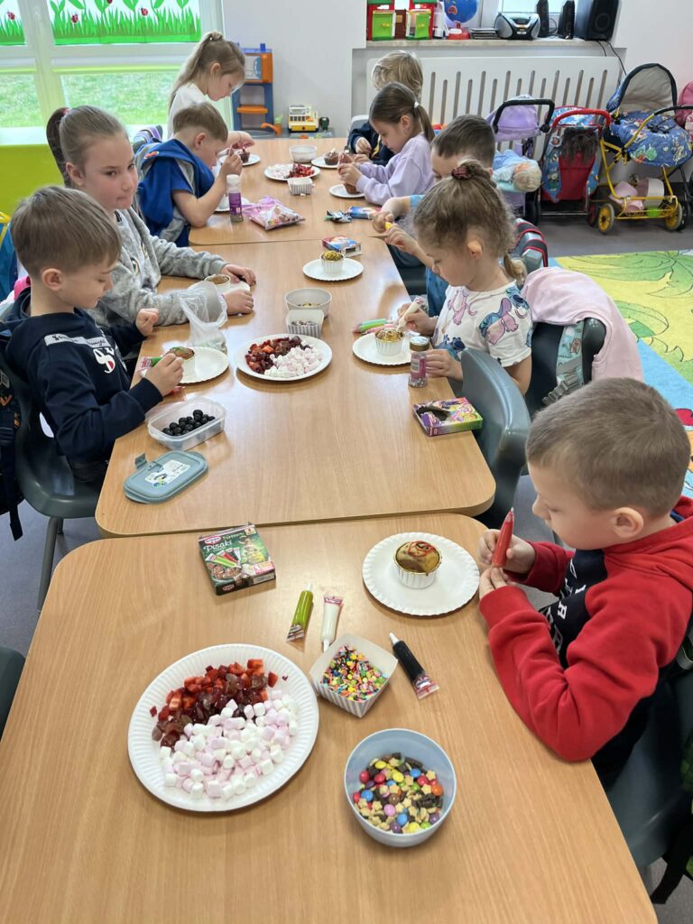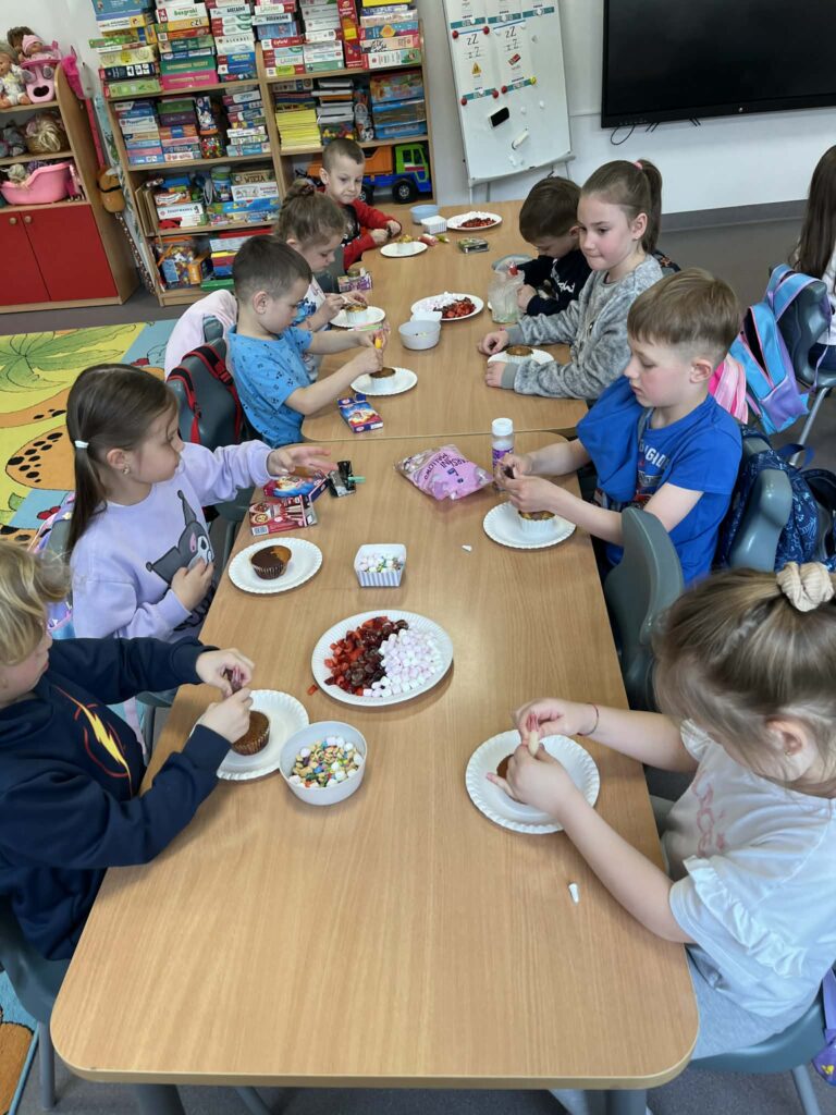 Największą atrakcją dnia było oczywiście dekorowanie muffinek. Dzieci z ogromnym zaangażowaniem ozdabiały swoje wypieki, wykorzystując różnorodne dodatki, takie jak owoce, kolorowe posypki czy bita śmietana. Każda muffinka była wyjątkowa i odzwierciedlała pomysłowość oraz kreatywność małych cukierników.