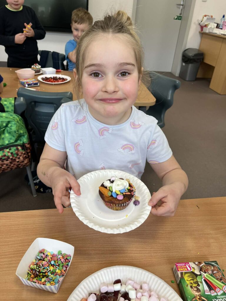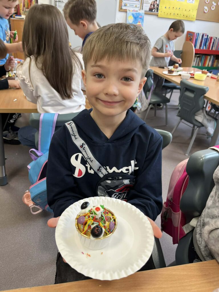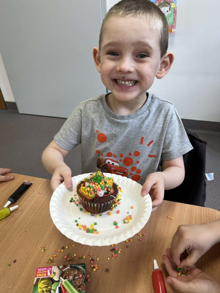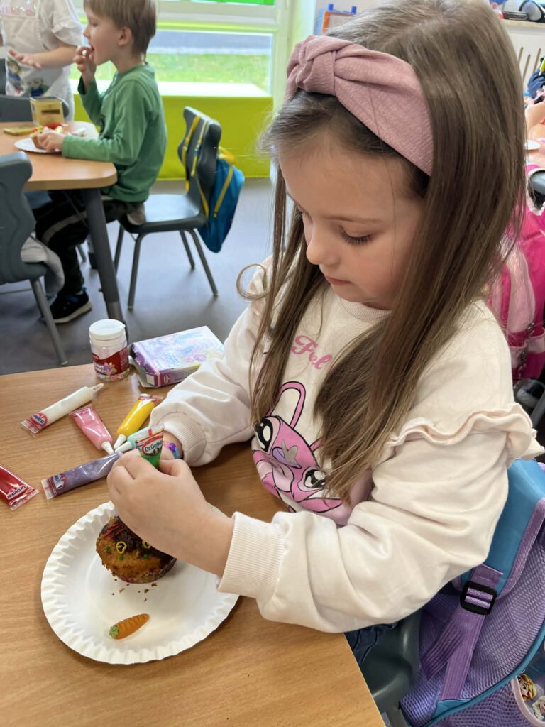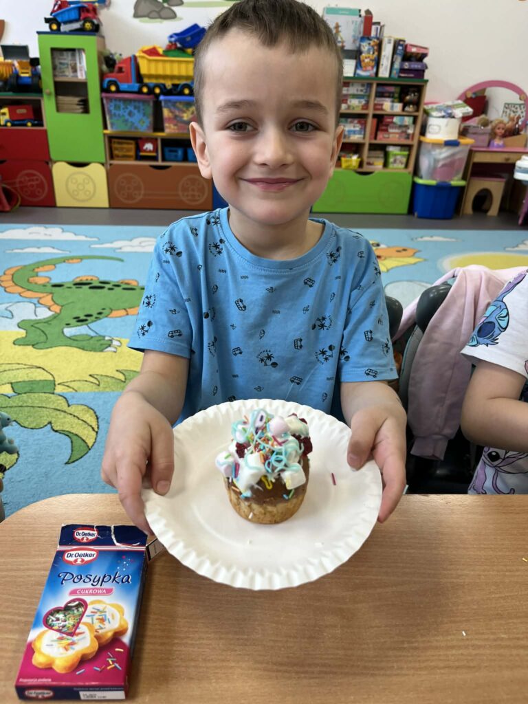 Największą atrakcją dnia było oczywiście dekorowanie muffinek. Dzieci z ogromnym zaangażowaniem ozdabiały swoje wypieki, wykorzystując różnorodne dodatki, takie jak owoce, kolorowe posypki czy bita śmietana. Każda muffinka była wyjątkowa i odzwierciedlała pomysłowość oraz kreatywność małych cukierników.