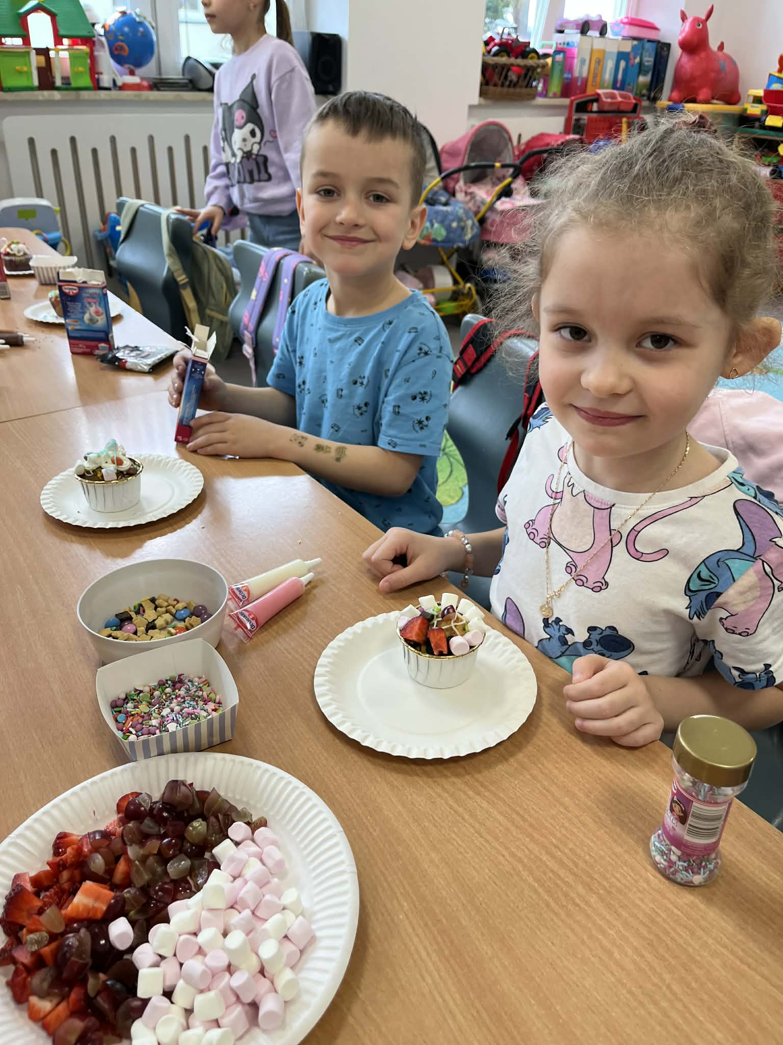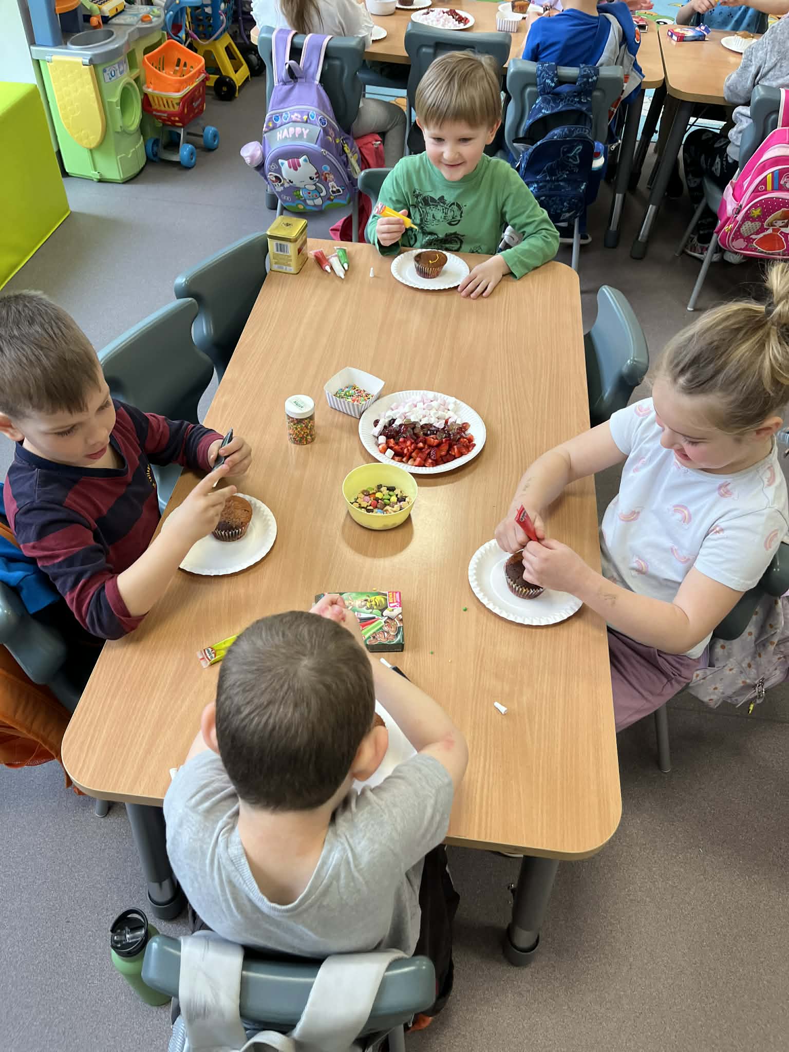 Największą atrakcją dnia było oczywiście dekorowanie muffinek. Dzieci z ogromnym zaangażowaniem ozdabiały swoje wypieki, wykorzystując różnorodne dodatki, takie jak owoce, kolorowe posypki czy bita śmietana. Każda muffinka była wyjątkowa i odzwierciedlała pomysłowość oraz kreatywność małych cukierników.