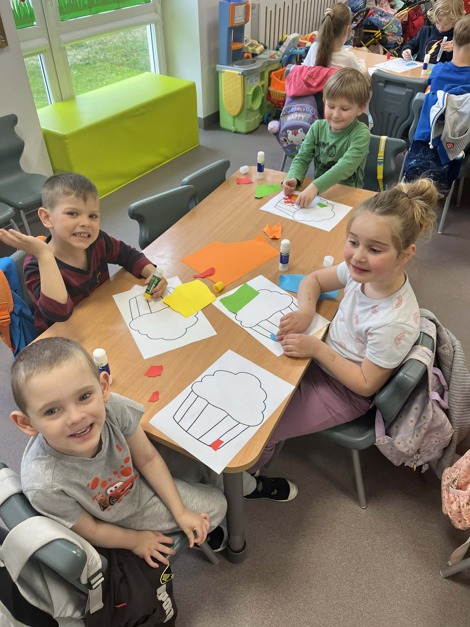 Po słodkiej degustacji przedszkolaki wykonały pracę plastyczną – kolorowe muffinki z papieru i waty, które stały się piękną pamiątką tego dnia.