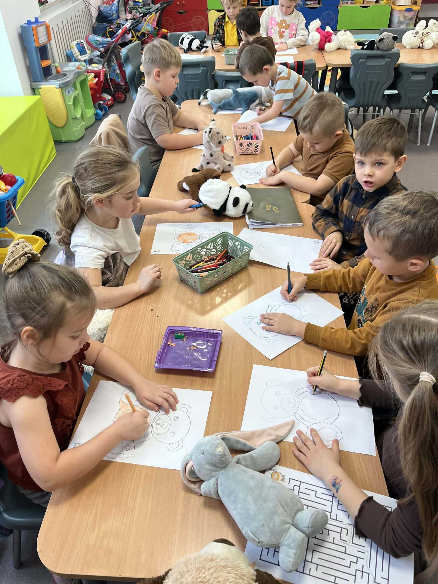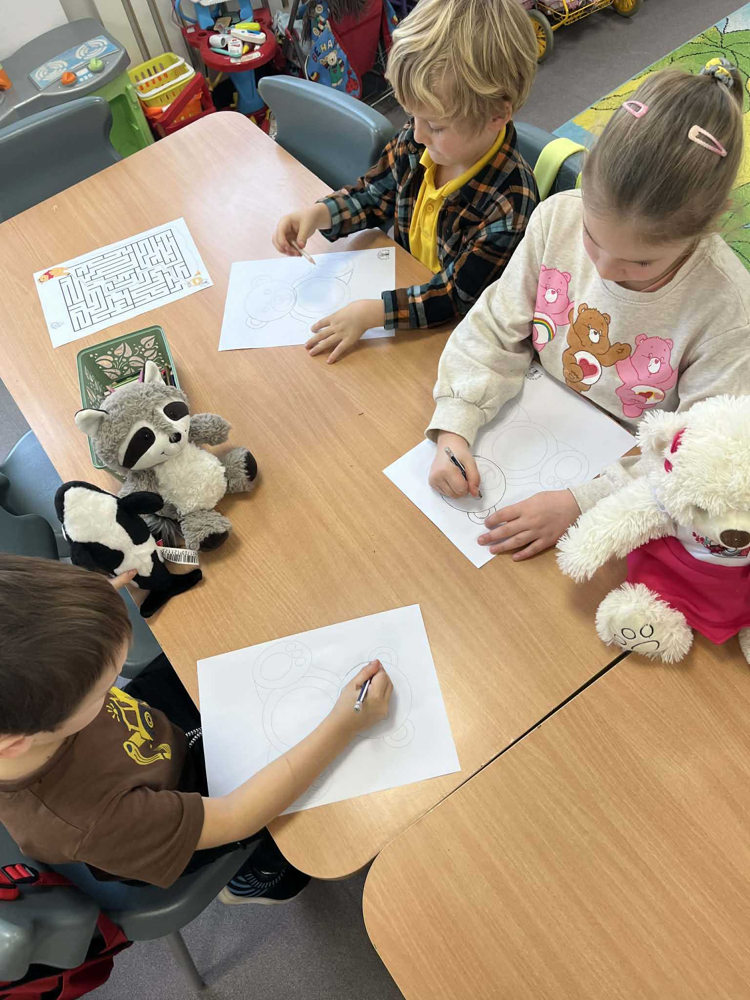 W części plastycznej dzieci tworzyły portrety swoich misiów, wykonywały prace z misiowymi motywami, kolorowały tematyczne obrazki i odznaki „Przyjaciela Pluszowego Misia”. Grupy podejmowały się także układania misiowych puzzli i prac manualnych, rozwijając precyzję oraz koordynację wzrokowo-ruchową.