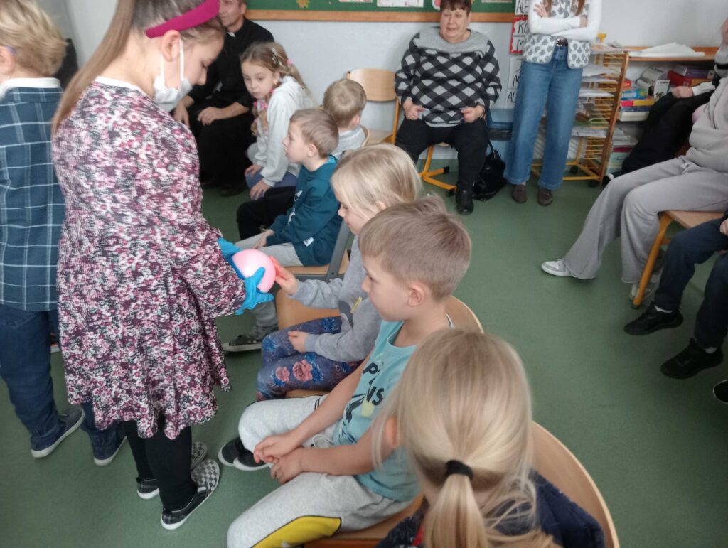 Wśród zebranych byli: klasa pierwsza, klasa druga oraz dwie grupy przedszkolne z wychowawczyniami i paniami pomocami nauczyciela, klasa szósta z księdzem oraz pani  dyrektor i pani psycholog.