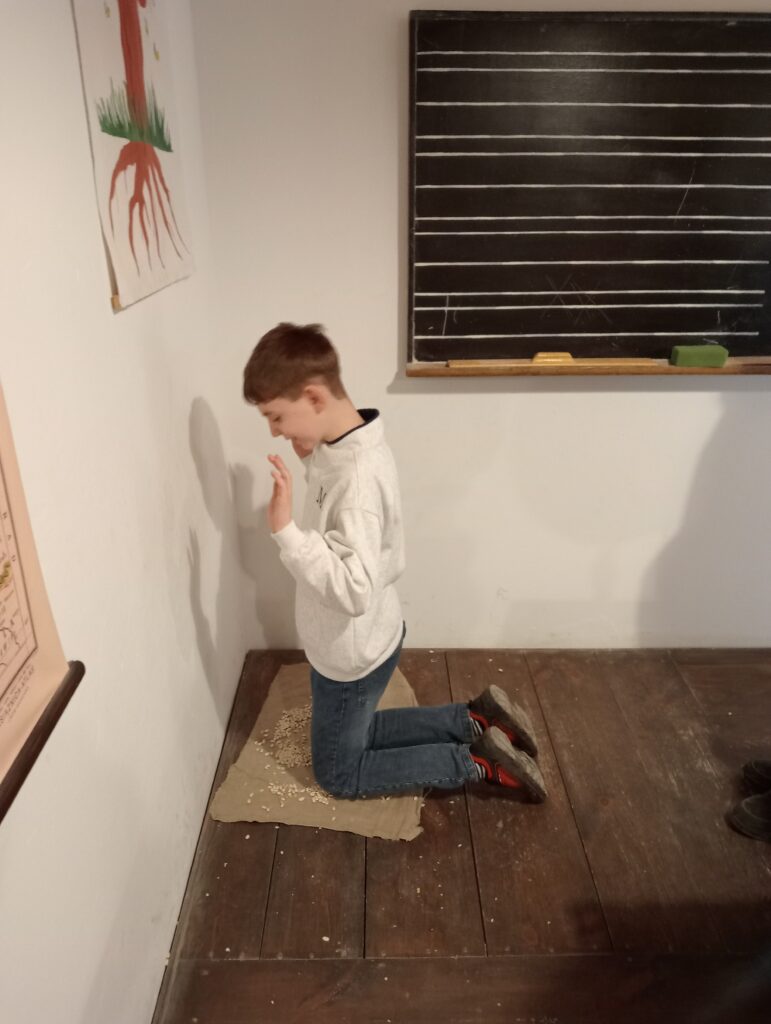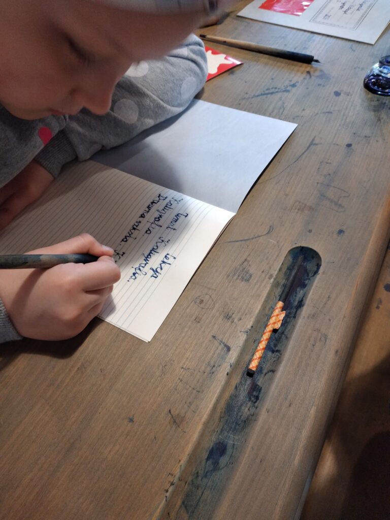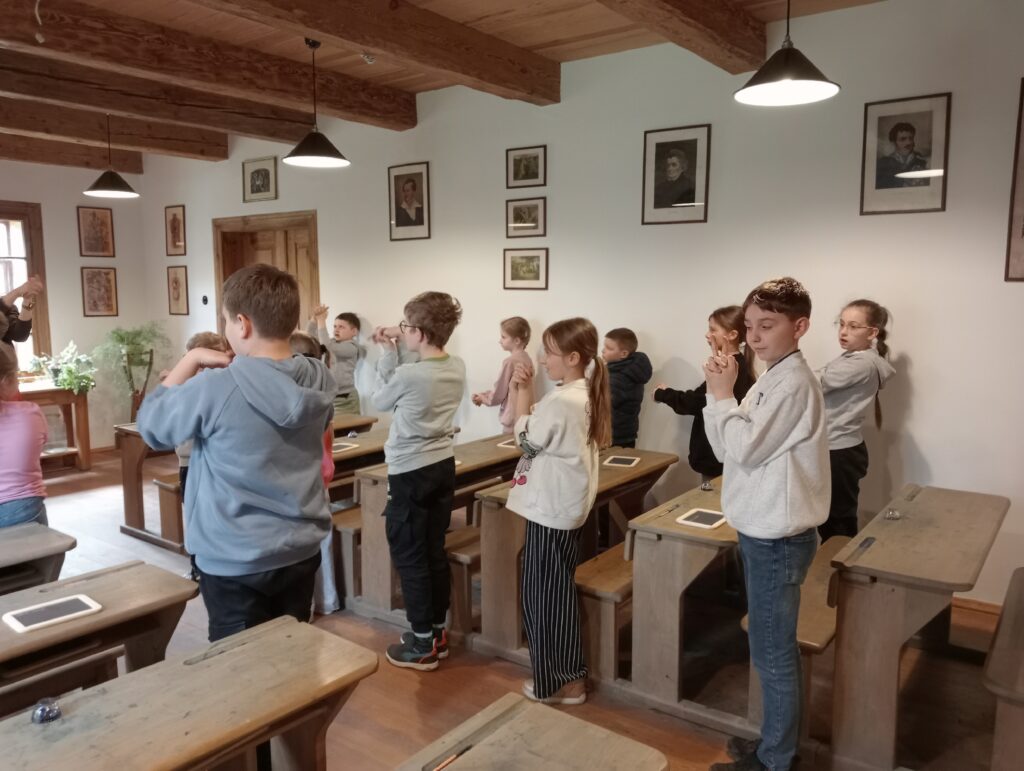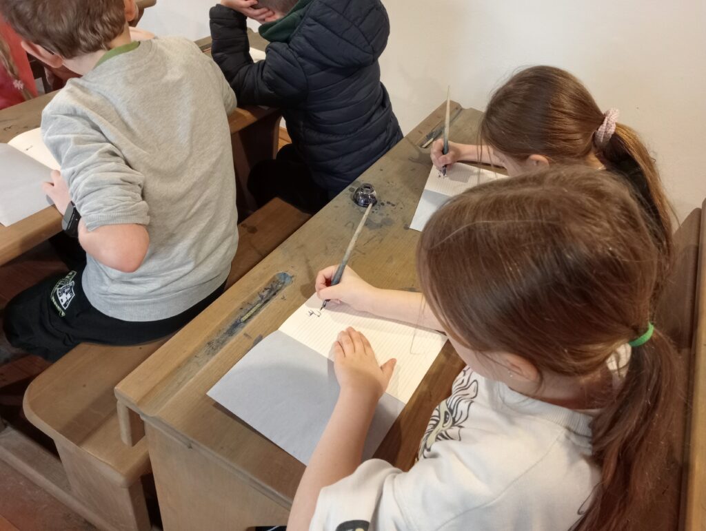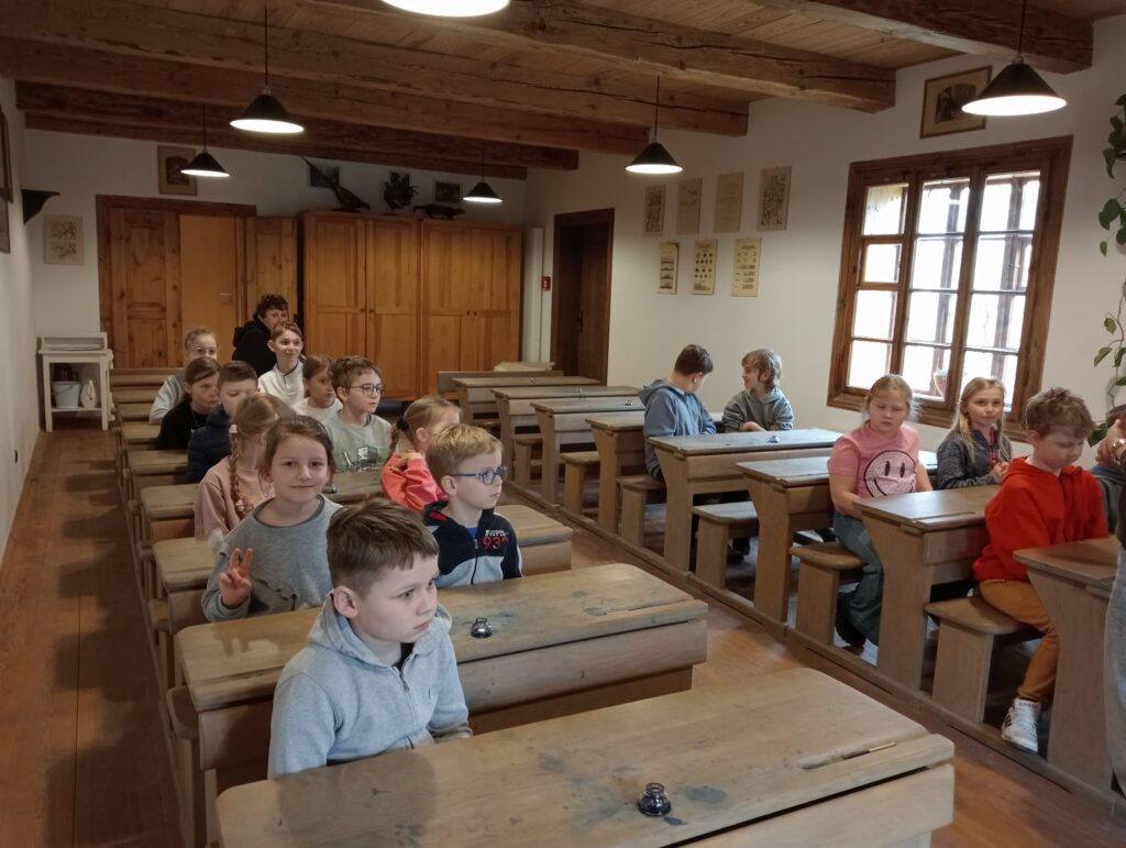 Głównym celem wycieczki był udział w zajęciach „W dawnej klasie- próba kaligrafii”. Pani przewodnik, nauczycielka w dawnej klasie, uczyła o przyborach do nauki, o kleksach i ćwiczeniach cielesnych. Każdy ochotnik mógł także spróbować kary dla niegrzecznych dzieci: klęczenia na grochu. Wrażenia były różne: niektórzy nawet chcieli przenieść taką karę do swojej klasy, no, chyba to żart… .
