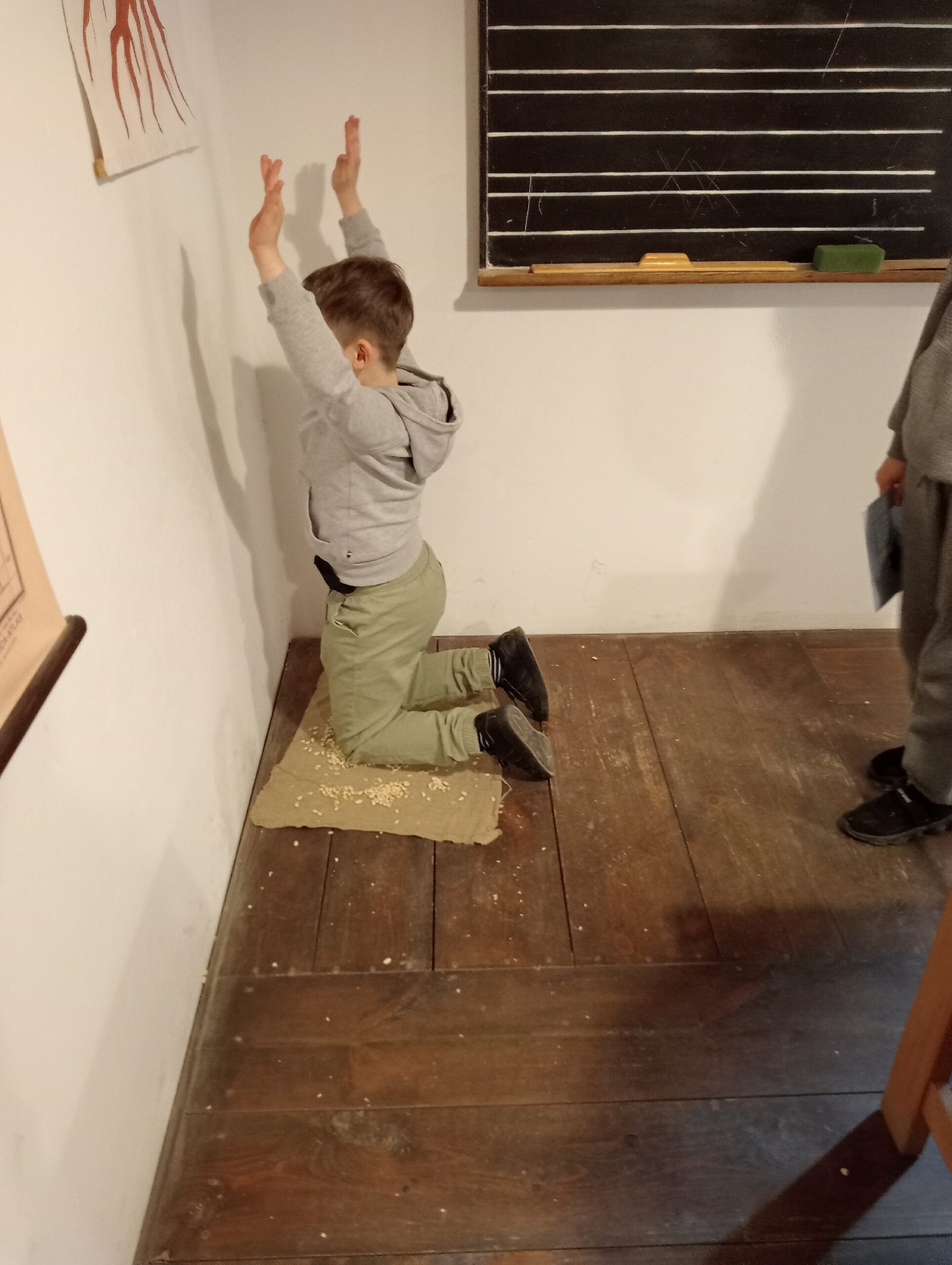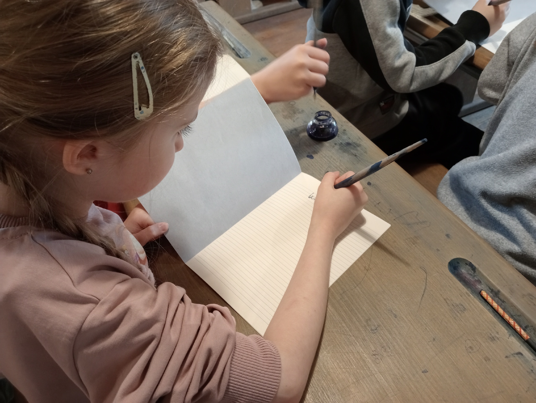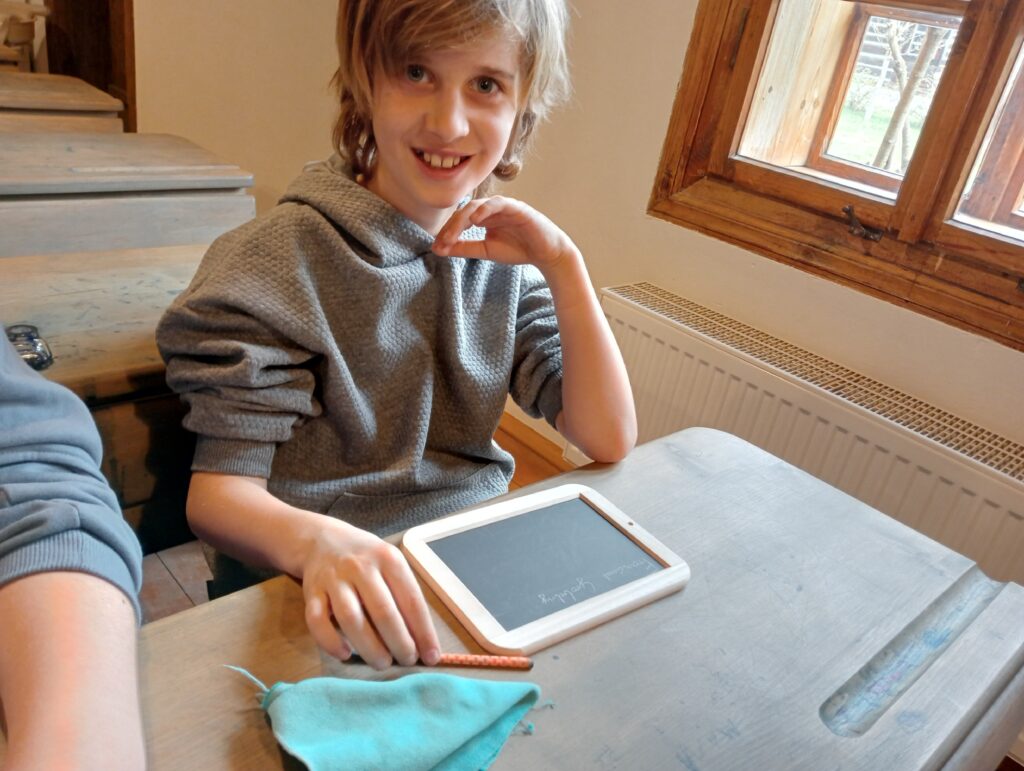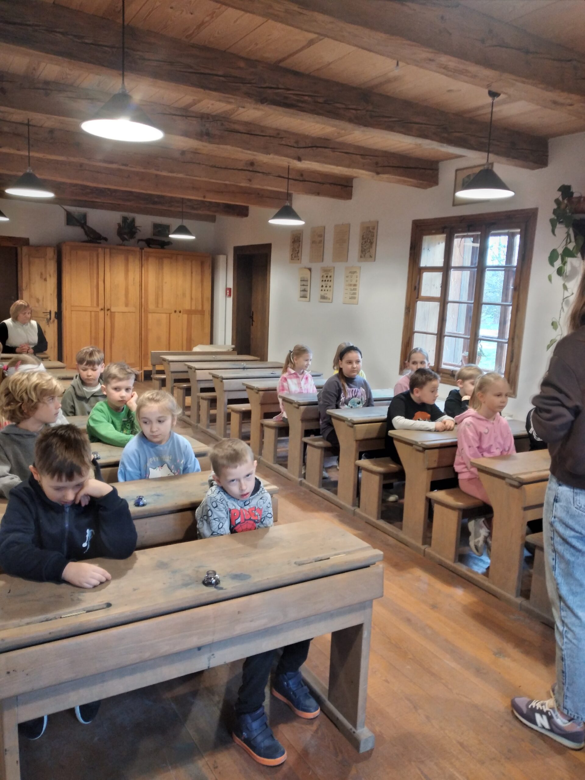 Głównym celem wycieczki był udział w zajęciach „W dawnej klasie- próba kaligrafii”. Pani przewodnik, nauczycielka w dawnej klasie, uczyła o przyborach do nauki, o kleksach i ćwiczeniach cielesnych. Każdy ochotnik mógł także spróbować kary dla niegrzecznych dzieci: klęczenia na grochu. Wrażenia były różne: niektórzy nawet chcieli przenieść taką karę do swojej klasy, no, chyba to żart… .