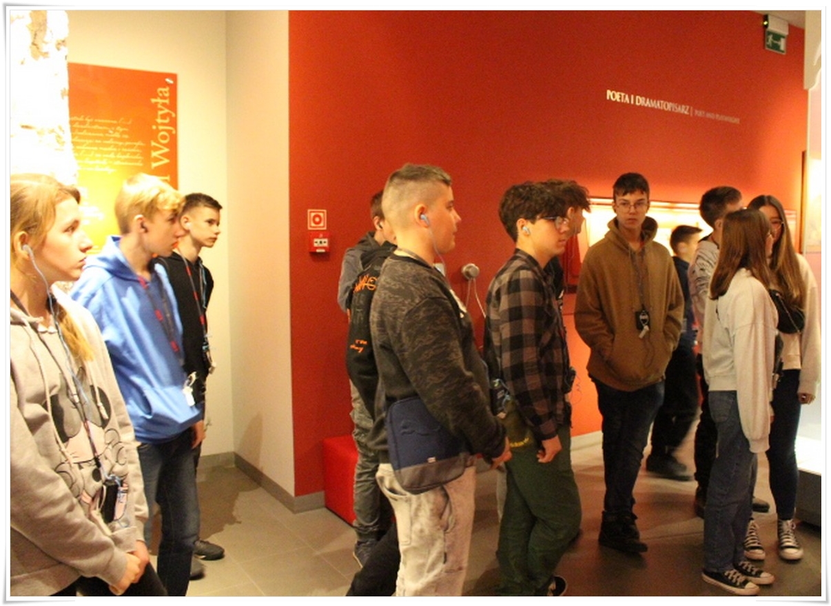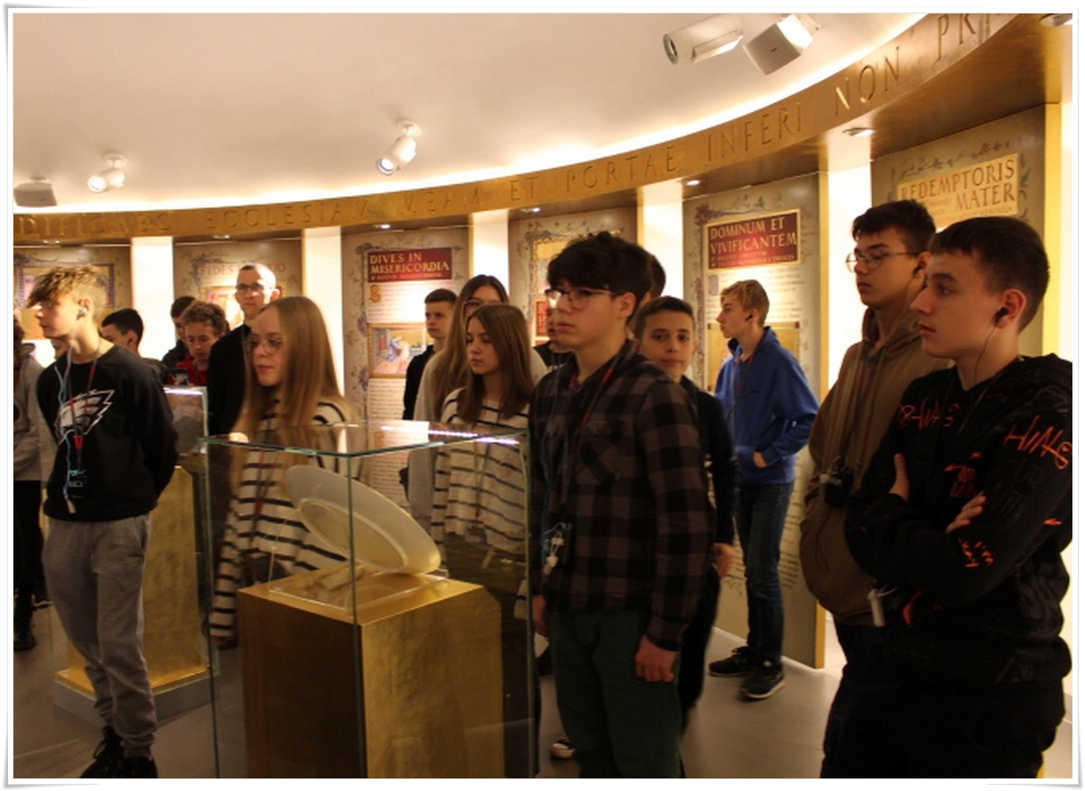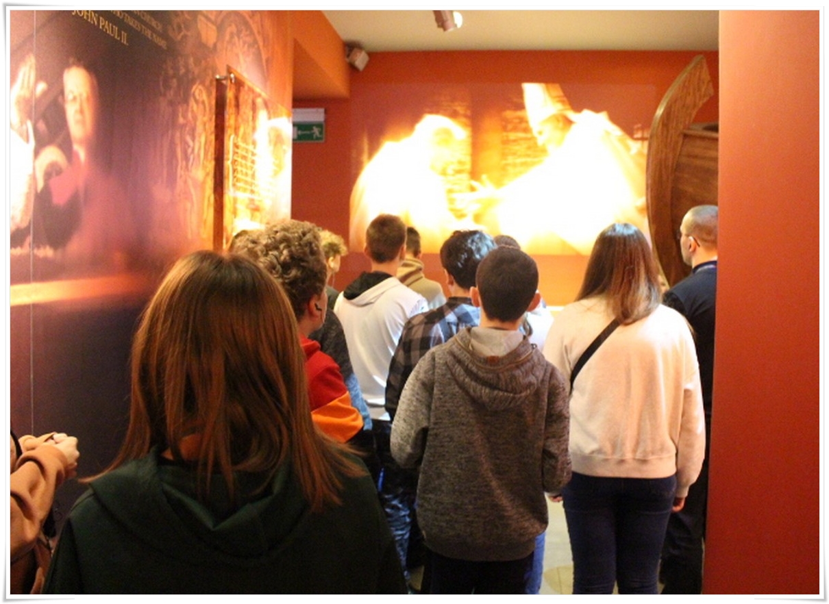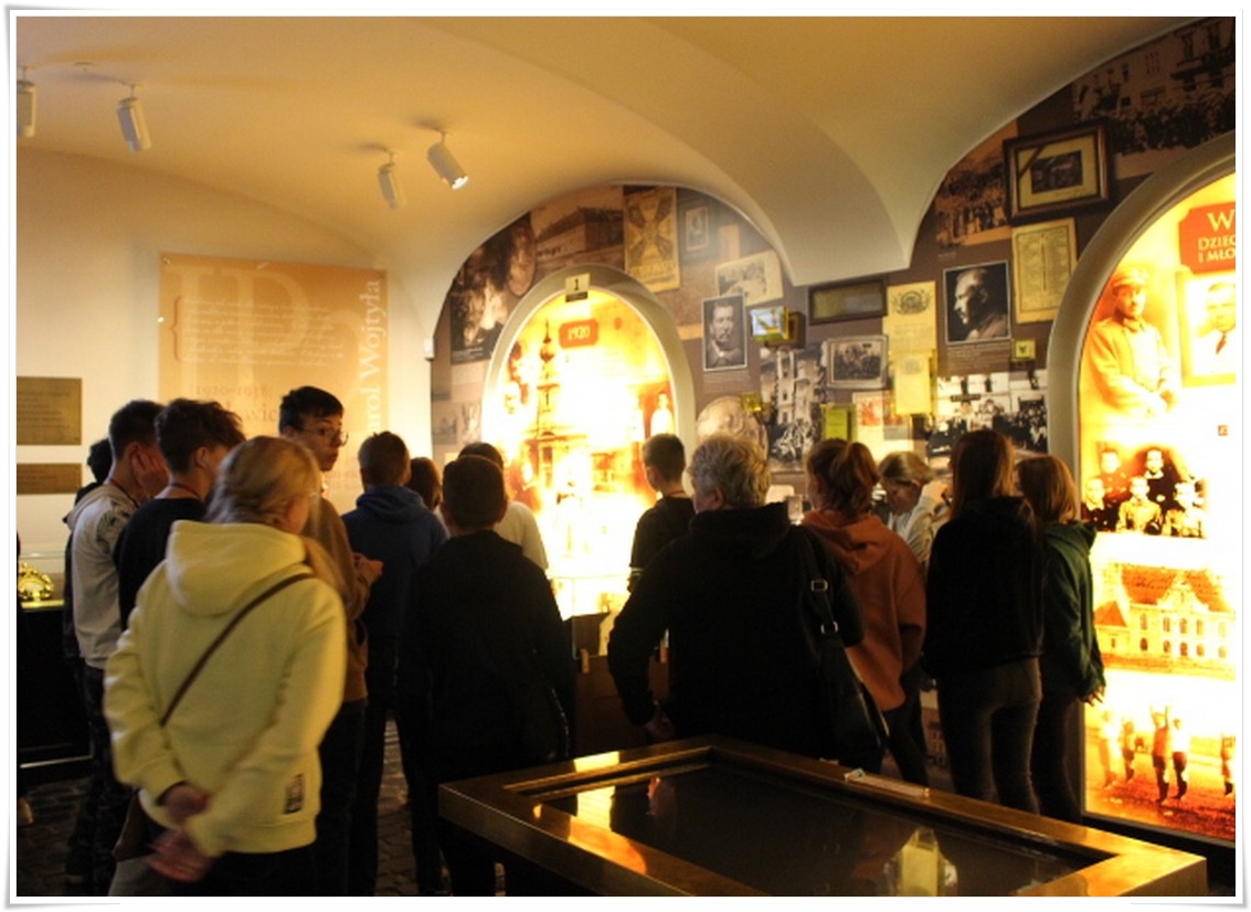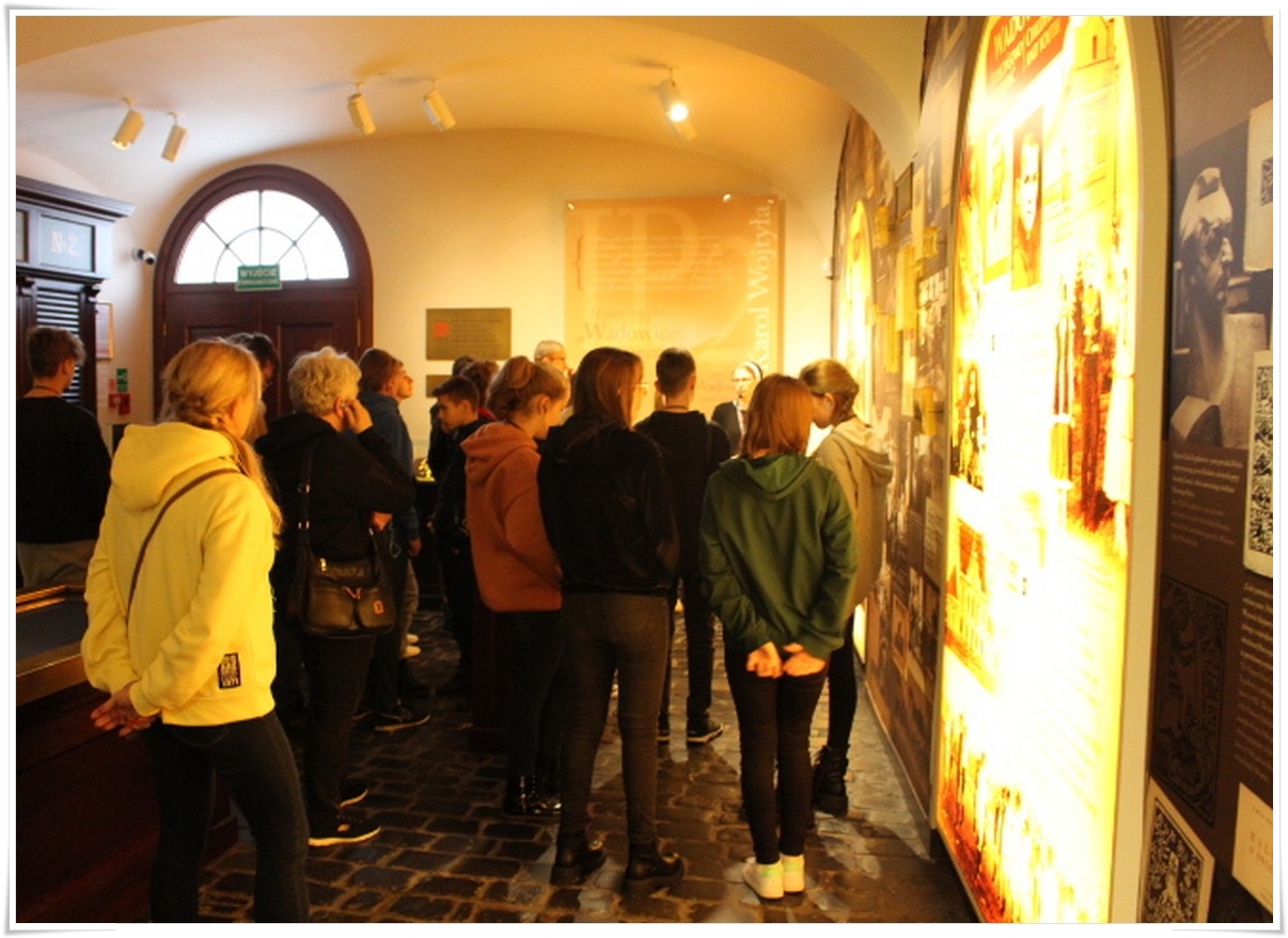 Pierwszym punktem wyjazdu była wizyta w Muzeum Dom Rodzinny Jana Pawła II w Wadowicach, gdzie uczniowie mogli poznać historię życia naszego wielkiego Rodaka – Karola Wojtyły – Papieża Jana Pawła II. W Wadowicach spędził całe swe dzieciństwo oraz młodość. Zwiedzający mogli zobaczyć oryginalne pamiątki lub ich repliki z okresu, gdy w tym miejscu mieszkał młody Karol Wojtyła. Zgromadzono tu również wiele rzeczy związanych z późniejszym jego życiem, zarówno, gdy był biskupem, arcybiskupem, kardynałem oraz papieżem. Wizyta w tym muzeum to swego rodzaju podróż przez ponad 80 lat historii XX wieku, której częścią był Papież Polak. Po wyjściu z muzeum uczestnicy wycieczki udali się do wadowickiej Bazyliki, aby pomodlić się przy chrzcielnicy, przy której ochrzczony został Karol Wojtyła.