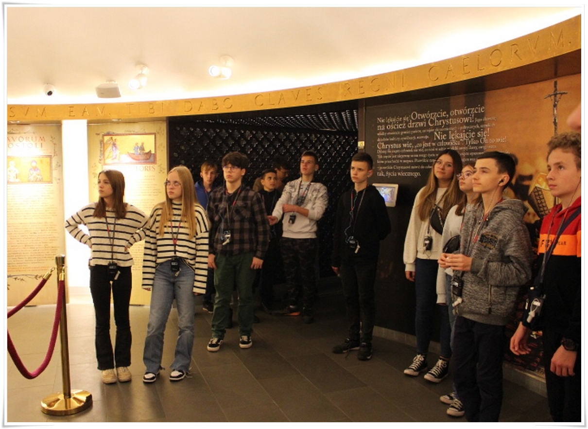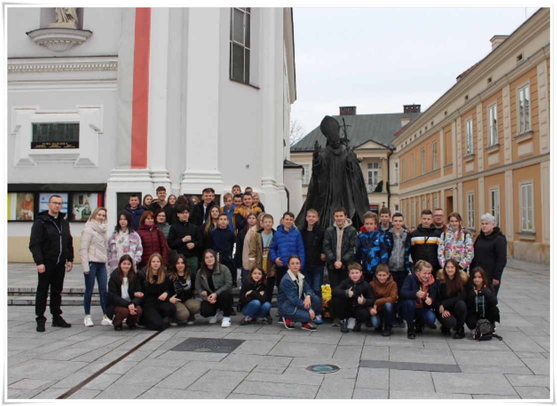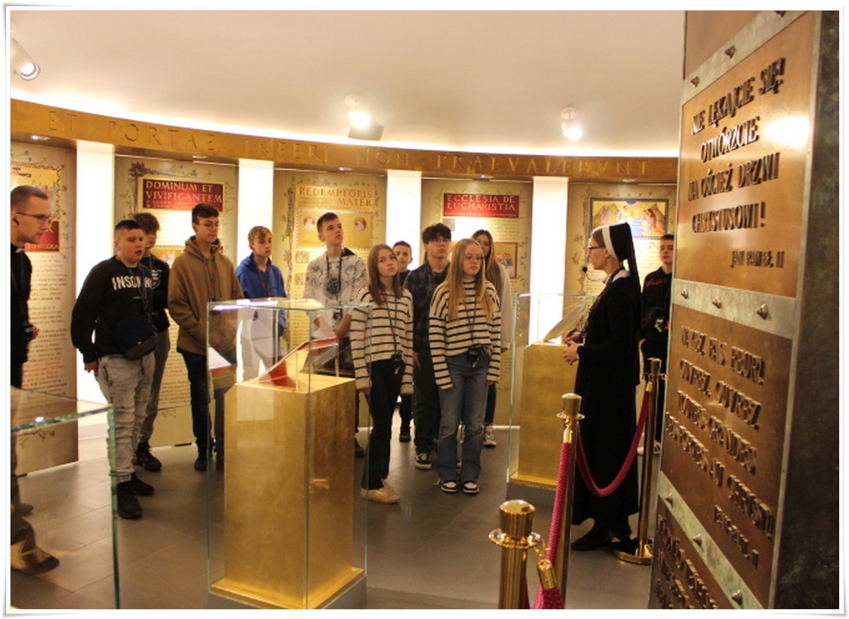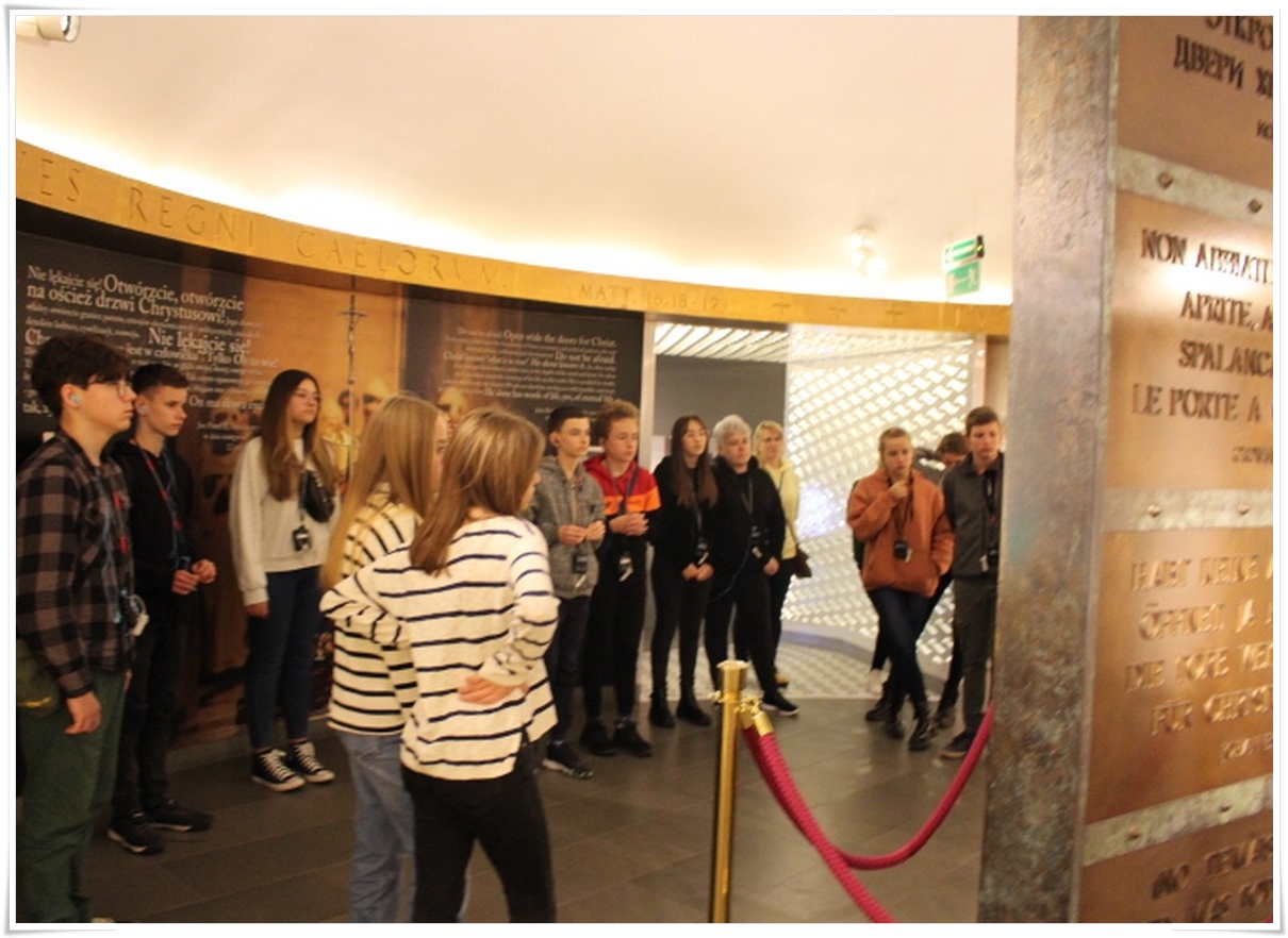 Pierwszym punktem wyjazdu była wizyta w Muzeum Dom Rodzinny Jana Pawła II w Wadowicach, gdzie uczniowie mogli poznać historię życia naszego wielkiego Rodaka – Karola Wojtyły – Papieża Jana Pawła II. W Wadowicach spędził całe swe dzieciństwo oraz młodość. Zwiedzający mogli zobaczyć oryginalne pamiątki lub ich repliki z okresu, gdy w tym miejscu mieszkał młody Karol Wojtyła. Zgromadzono tu również wiele rzeczy związanych z późniejszym jego życiem, zarówno, gdy był biskupem, arcybiskupem, kardynałem oraz papieżem. Wizyta w tym muzeum to swego rodzaju podróż przez ponad 80 lat historii XX wieku, której częścią był Papież Polak. Po wyjściu z muzeum uczestnicy wycieczki udali się do wadowickiej Bazyliki, aby pomodlić się przy chrzcielnicy, przy której ochrzczony został Karol Wojtyła.