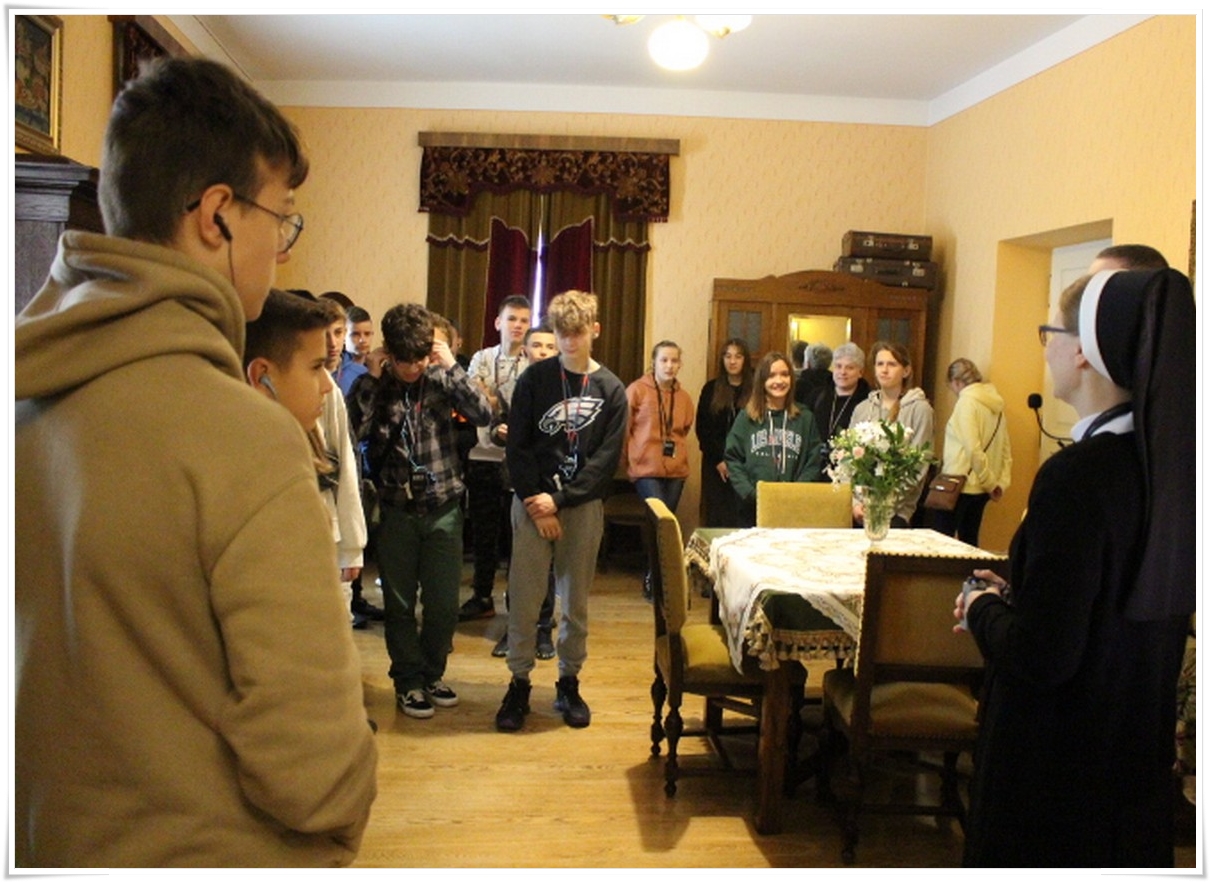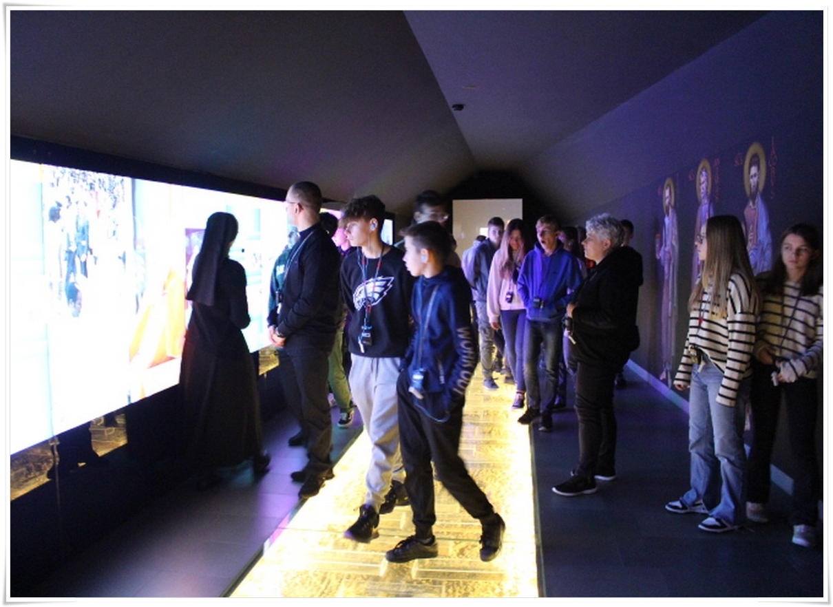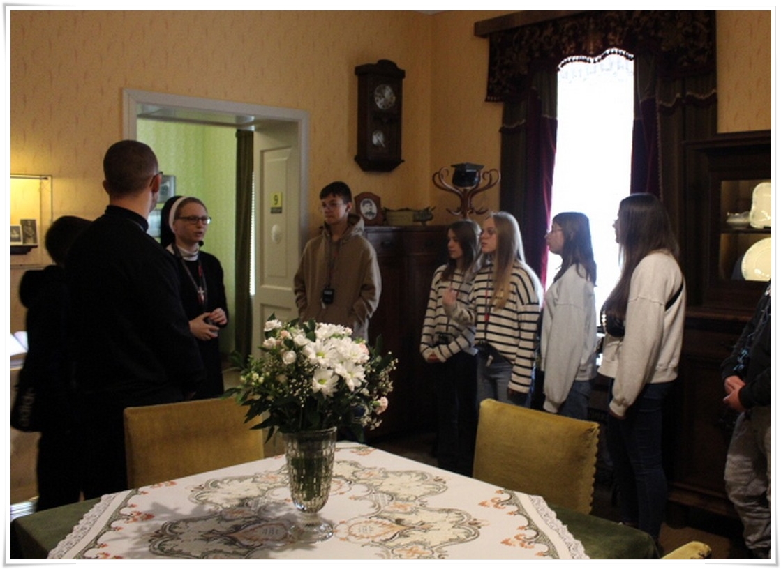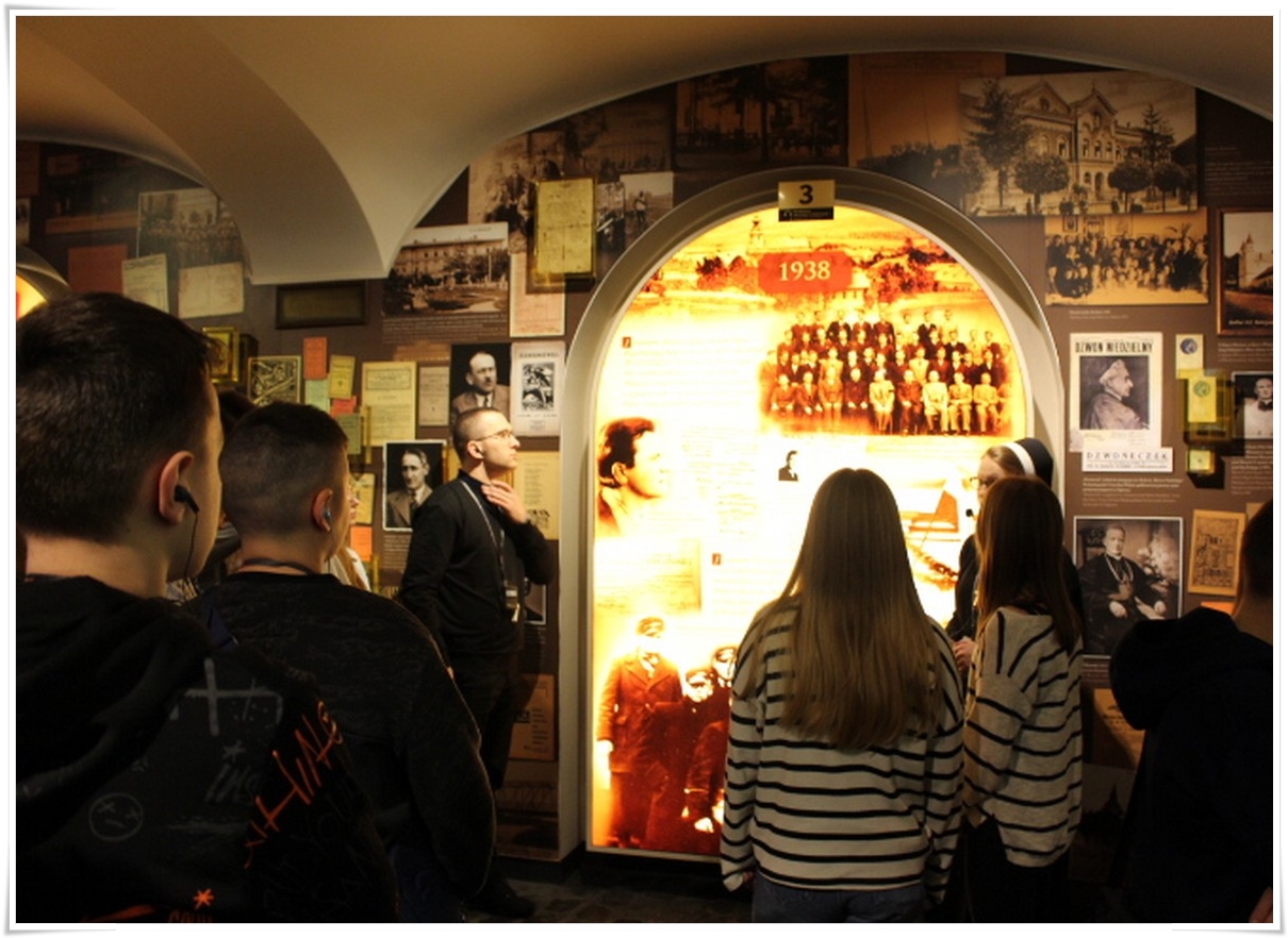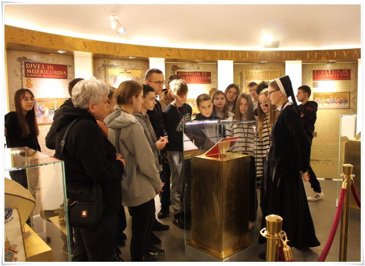 Pierwszym punktem wyjazdu była wizyta w Muzeum Dom Rodzinny Jana Pawła II w Wadowicach, gdzie uczniowie mogli poznać historię życia naszego wielkiego Rodaka – Karola Wojtyły – Papieża Jana Pawła II. W Wadowicach spędził całe swe dzieciństwo oraz młodość. Zwiedzający mogli zobaczyć oryginalne pamiątki lub ich repliki z okresu, gdy w tym miejscu mieszkał młody Karol Wojtyła. Zgromadzono tu również wiele rzeczy związanych z późniejszym jego życiem, zarówno, gdy był biskupem, arcybiskupem, kardynałem oraz papieżem. Wizyta w tym muzeum to swego rodzaju podróż przez ponad 80 lat historii XX wieku, której częścią był Papież Polak. Po wyjściu z muzeum uczestnicy wycieczki udali się do wadowickiej Bazyliki, aby pomodlić się przy chrzcielnicy, przy której ochrzczony został Karol Wojtyła.