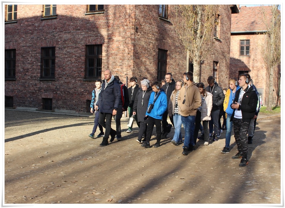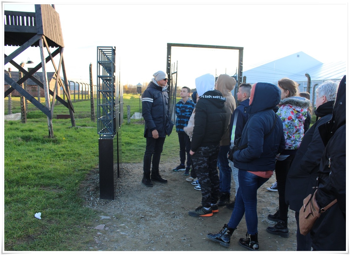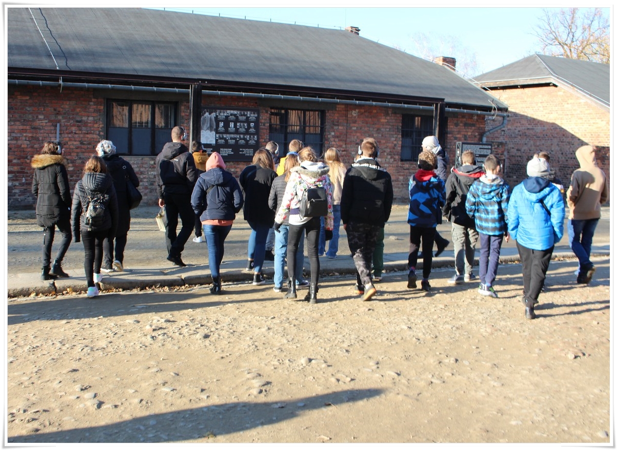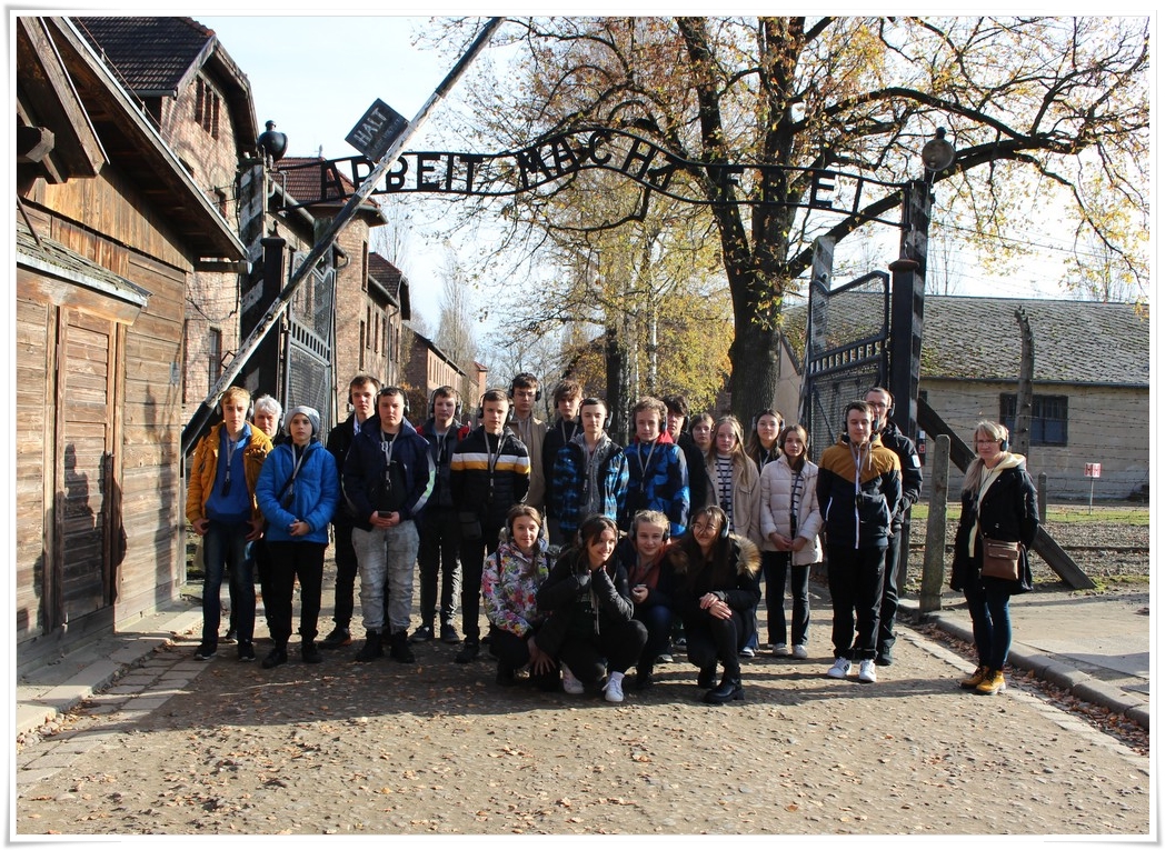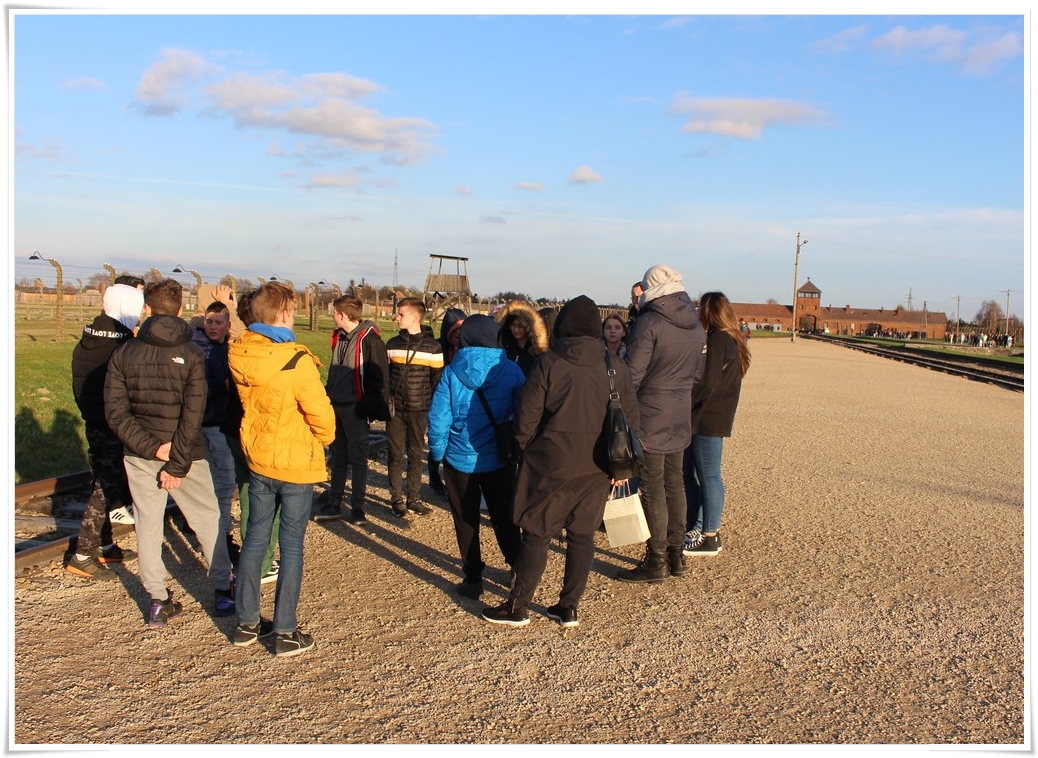Druga część wycieczki to niezwykle ważna lekcja historii – wizyta w Muzeum Auschwitz Birkenau. Jest to miejsce pamięci, które każdy powinien zobaczyć, aby poznać jak okrutny był czas II wojny światowej oraz co potrafił człowiek zrobić drugiemu człowiekowi. Zwiedzanie rozpoczyna się od przejścia przez bramę z napisem „Arbacht macht frei”, która uzmysławia tak naprawdę wtedy, w jakim miejscu się znajdujemy. Podczas wędrówki po terenie byłego obozu przewodnik opowiada o losach ludzi, którzy tu trafili. Przejmująca jest wizyta w jedynej zachowanej na terenie obozu komorze gazowej oraz krematorium. W drugiej części zwiedzania uczestnicy udali się do sąsiedniej Brzezinki, gdzie mogli zobaczyć w jakich warunkach byli przywożeni do obozu więźniowie oraz w jakich barakach mieszkali. Dzięki tego typu wyjazdom mamy okazję uświadomić kolejnym młodym pokoleniom, czym kończy się dopuszczenie do władzy szaleńców, którzy w imię osobistych, często szalonych planów uciekają się do takich okrucieństw.