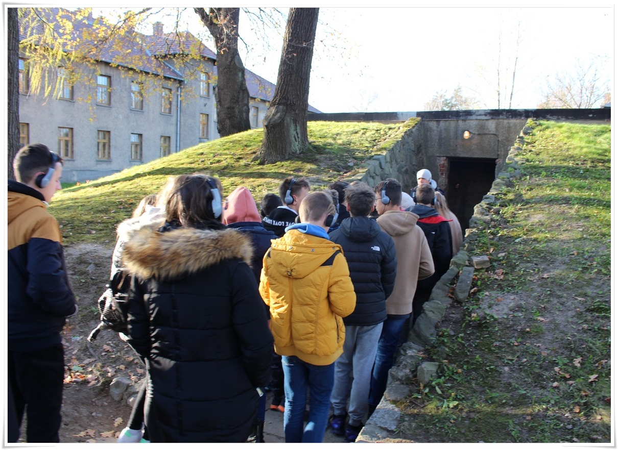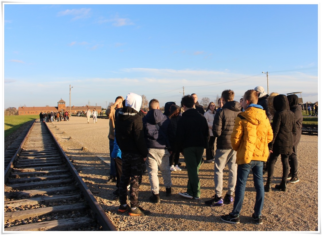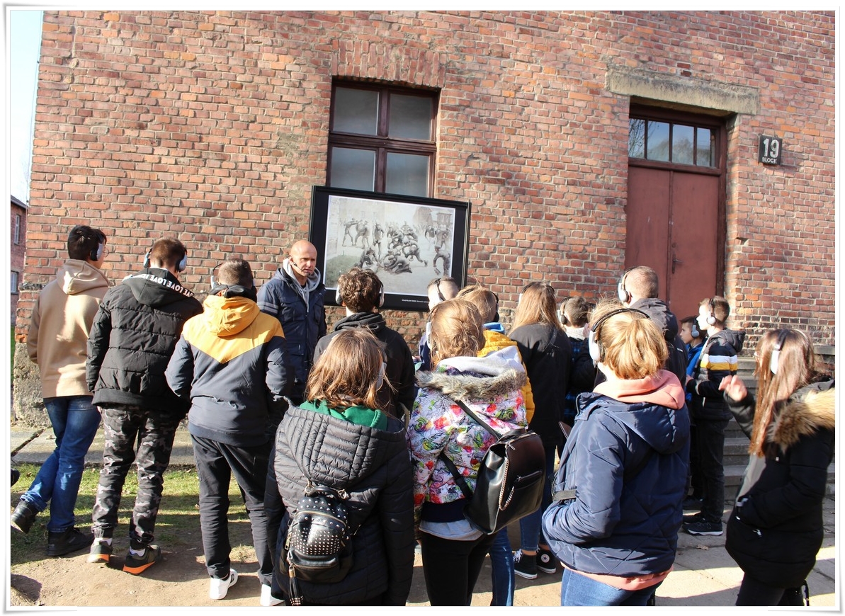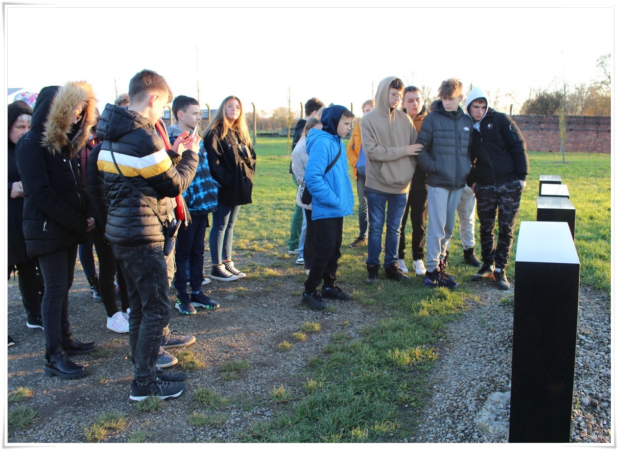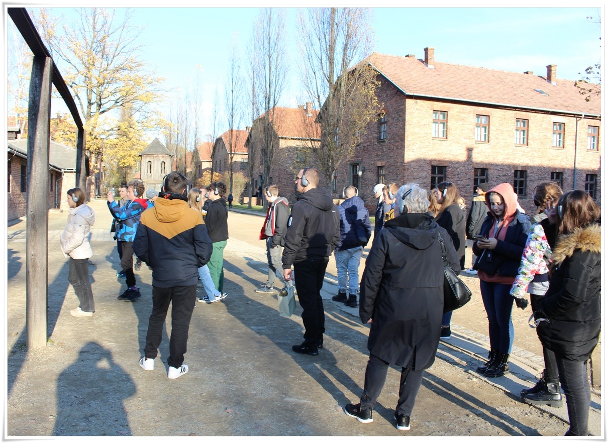 Druga część wycieczki to niezwykle ważna lekcja historii – wizyta w Muzeum Auschwitz Birkenau. Jest to miejsce pamięci, które każdy powinien zobaczyć, aby poznać jak okrutny był czas II wojny światowej oraz co potrafił człowiek zrobić drugiemu człowiekowi. Zwiedzanie rozpoczyna się od przejścia przez bramę z napisem „Arbacht macht frei”, która uzmysławia tak naprawdę wtedy, w jakim miejscu się znajdujemy. Podczas wędrówki po terenie byłego obozu przewodnik opowiada o losach ludzi, którzy tu trafili. Przejmująca jest wizyta w jedynej zachowanej na terenie obozu komorze gazowej oraz krematorium. W drugiej części zwiedzania uczestnicy udali się do sąsiedniej Brzezinki, gdzie mogli zobaczyć w jakich warunkach byli przywożeni do obozu więźniowie oraz w jakich barakach mieszkali. Dzięki tego typu wyjazdom mamy okazję uświadomić kolejnym młodym pokoleniom, czym kończy się dopuszczenie do władzy szaleńców, którzy w imię osobistych, często szalonych planów uciekają się do takich okrucieństw.